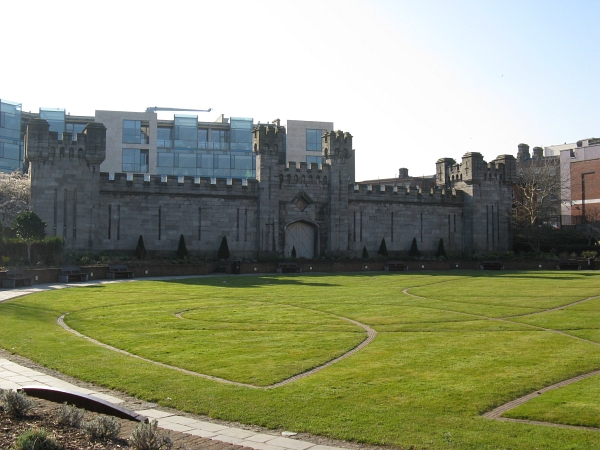 | Inside the grounds of Dublin Castle is the Dubh Linn Gardens. There is a Celtic design in the grass, which apparently is also used on rare occasions as a helicopter landing pad. |