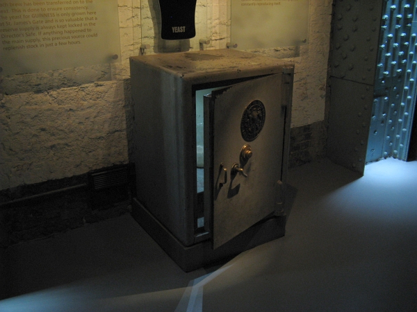 | The sign says that the yeast for Guinness is only grown at the St. James's Gate and that it is so valuable that a reserve supply is always kept locked in the Director's Safe. I hope this isn't the current safe because it's open and I think empty. |