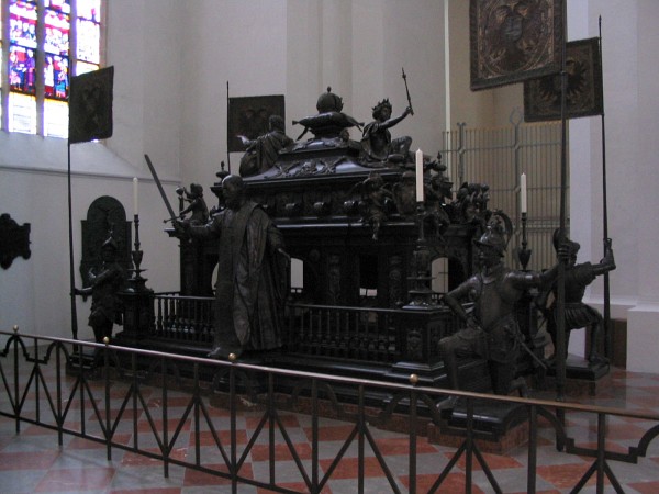 | Inside the Frauenkirche, aka the Cathedral of Our Blessed Lady. This is apparently a memorial in black marble to Louis IV of Bavaria, Holy Roman Emperor from 1328 to 1347. |