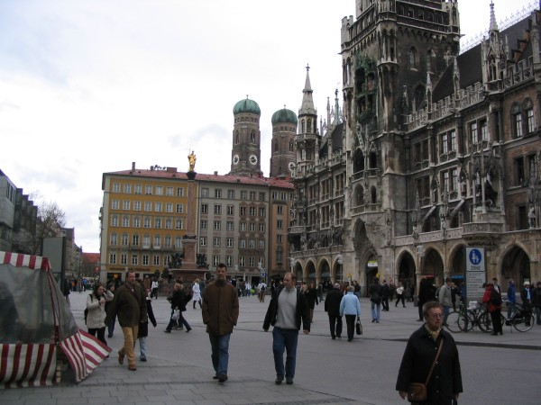 | After the long flight and little sleep, it was into the city for a bit. This is the Marienplatz. The big building with the gothic facade is the Neues Rathaus or New Town Hall. This is more or less the center of the old town. |