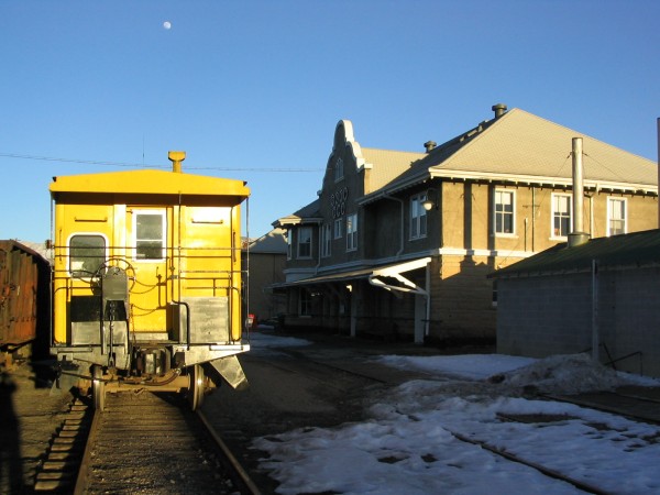 | A caboose in the late afternoon. This made a nice photo with the moon in the sky and the setting sun shining on the yellow railroad car. |