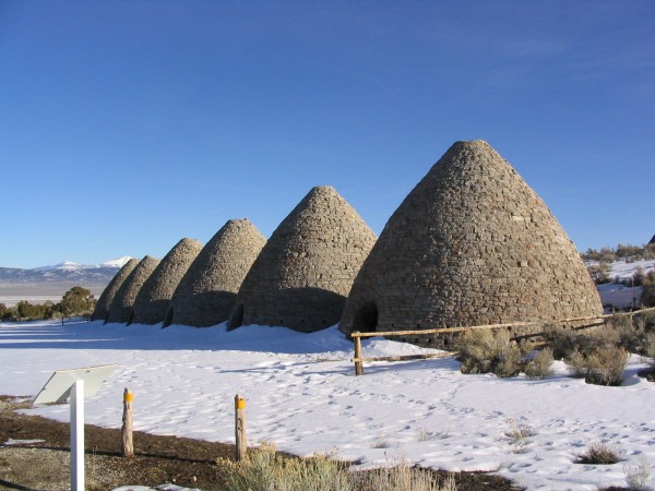 | Since I got to Ely earlier than I anticipated, I went back out on the road to find some other things. About twenty miles out of town I happened upon the Ward Charcoal Ovens State Historic Park. These beehive-shaped ovens were used in the late 19th century to generate charcoal for use in the mines of nearby Ward. |